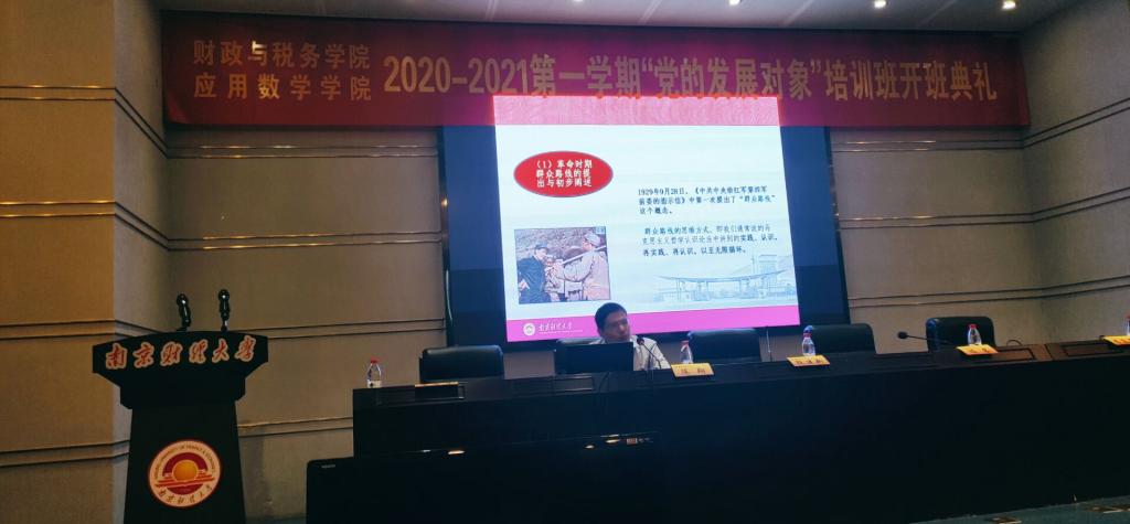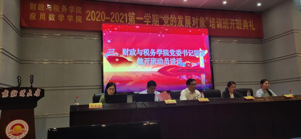 9月27日中午,我们和财政与税务学院联合开展的2020-2021学年第一学期“党的发展对象”培训班开班典礼在行政楼二楼报告厅举行。财政与税务学院党委书记陈苏、副书记李慕原,马克思主义学院党总支书记陈翔,伟德bv1946官网党总支书记殷建新、院长助理(分管学生工作)布丹丹及全体党校学员参加了开班典礼。开班典礼由伟德bv1946官网党总支书记殷建新主持。