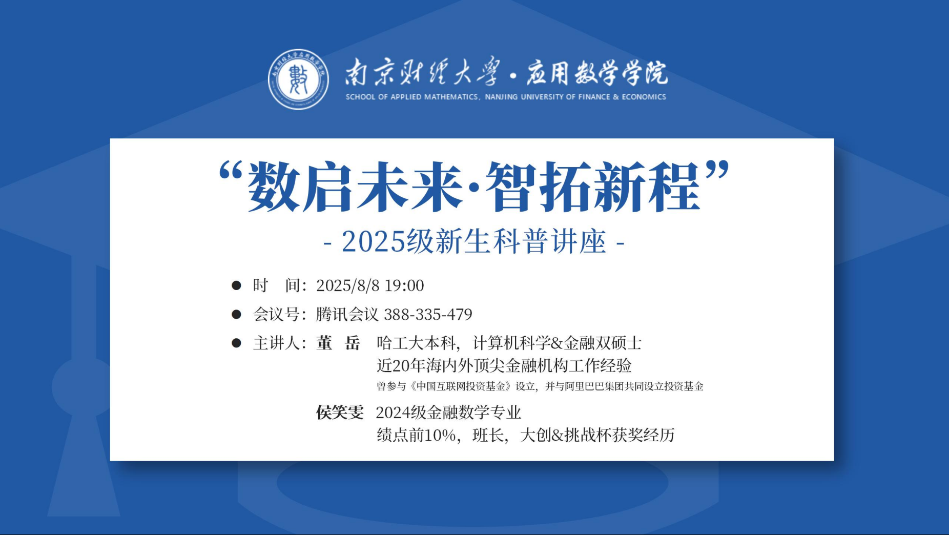 为助力2025级新生明确数学学科发展方向,我们于8月8日晚举办“数启未来·智拓新程:数学学科的成长坐标系与破界新路径”专题讲座,特邀资深金融从业背景的董岳老师及2024级优秀学生代表侯笑雯担任主讲,2025级新生参加活动。