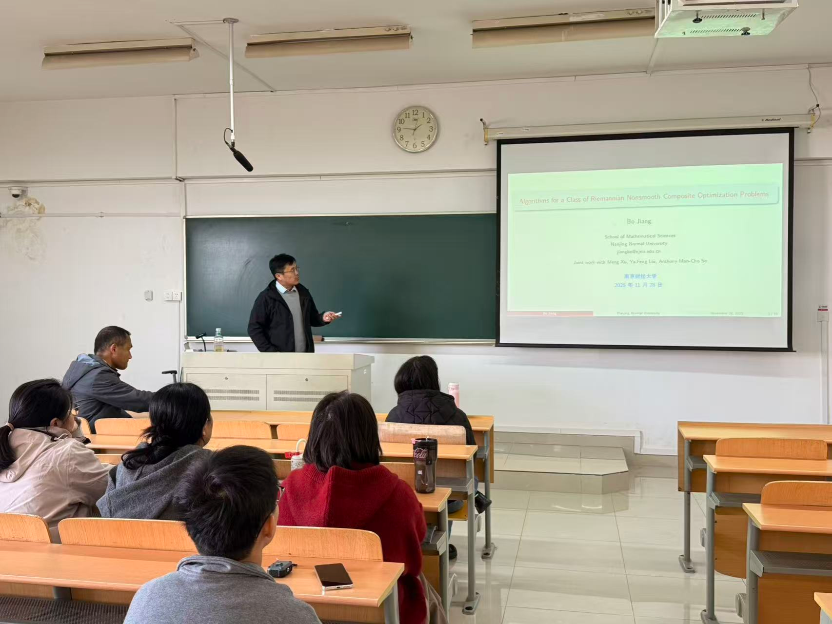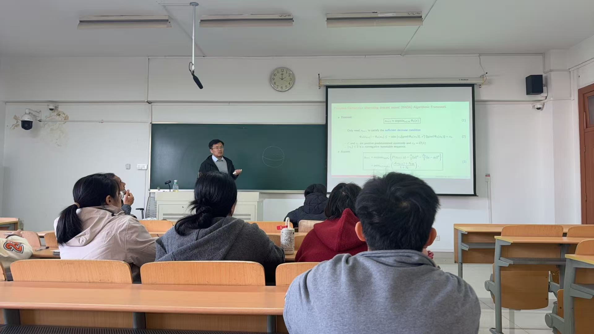 11月28日下午,应我们邀请,南京师范大学数学科学学院姜波教授在仙林校区博文楼408室作了题为“RADA: A Flexible Algorithmic Framework for Nonconvex-Linear Minimax Problems on Riemannian Manifolds”的学术讲座。学院相关教师和研究生参加讲座。